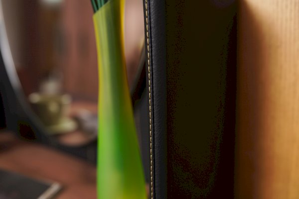 Изголовье кровати обтянуто экокожей черного цвета.