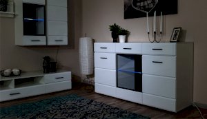 Модульная система Йорк выполнена в стиле минимализма. Строгие, лаконичные линии подчеркивают элегантность комплекта. Белый цвет мебели с деталями глубокого черного визуально сделает комнату светлее, просторнее и позволит составить безупречный по стилю комплект мебели. Сочетание глянцевой и стеклянной поверхностей, открытых полок создадут уютную обстановку и позволят украсить убранство комнаты приятными мелочами и разместить любимые книги и фото. Светодиодная подсветка придаст индивидуальность Вашей мебели. А широкая тумба для ТВ с выдвижными ящиками на телескопических направляющих позволит удобно разместить телевизор любой диагонали и другие медиаустройства Модульная система позволит подобрать по размеру вариант именно для Вашей комнаты, не оглядываясь на фиксированный размер, как в других стенках. Мебель выполнена из экологически безопасных материалов.