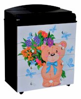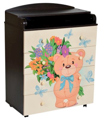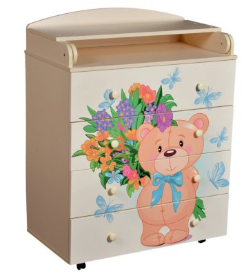 Пеленальный комод 800/4 Lilu 2 отличается привлекательным дизайном с использованием тематических детских принтов. В конструкции изделия предусмотрены 4 маленьких передвижных колеса, несколько вместительных ящичков на шариковых направляющих и откидывающаяся пеленальная столешница. Детский пеленальный комод, декорированный красочным рисунком, вмещает в себя постельные принадлежности, средства гигиены, распашонки, подгузники, игрушки, ползунки и другие личные вещи ребенка. Гладкая столешница идеально подходит для пеленания ребенка, а колесики позволяют быстро перемещать комод.
