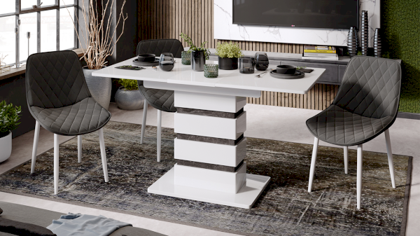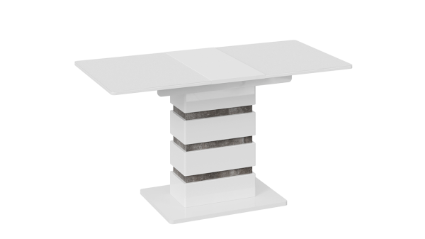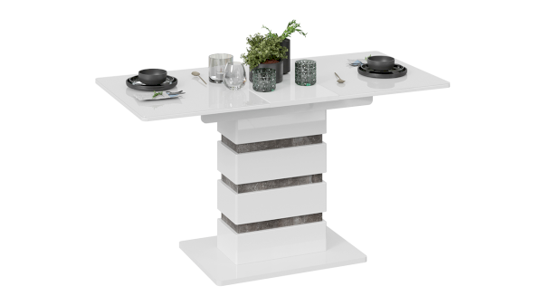 В модели реализовано модное сочетание белого глянца с каменной текстурой «Ателье темный», которое выглядит свежо и интересно. Новинка имеет необычное исполнение опоры с использованием декоративных накладок. Такая реализация добавит кухне оригинальности и эксцентричности.