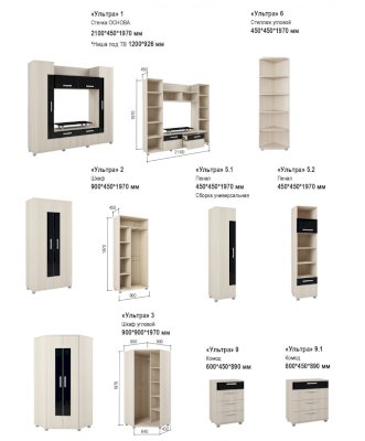 Модульная система «Ультра» - это оптимальный вариант для хранения множества вещей: от мелочей до предметов гардероба. Хотите приобрести такую мебель? Тогда остановите свой взгляд на модели «Ультра». Современный дизайн, оригинальная фурнитура, интересное цвето-фактурное решение модульной системы создадут уютный и неповторимый интерьер в Вашей гостиной.