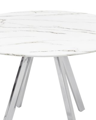 Обеденный стол с красивой стеклянной круглой столешницей белого цвета с рисунком под мрамор. Столешница гармонирует с металлическими ножками оригинальной формы. Такое сочетание смотрится эффектно в любом интерьере.