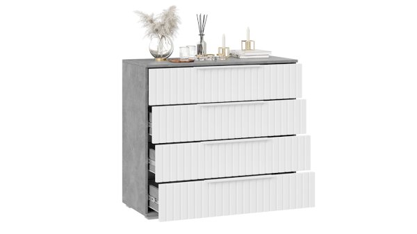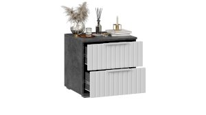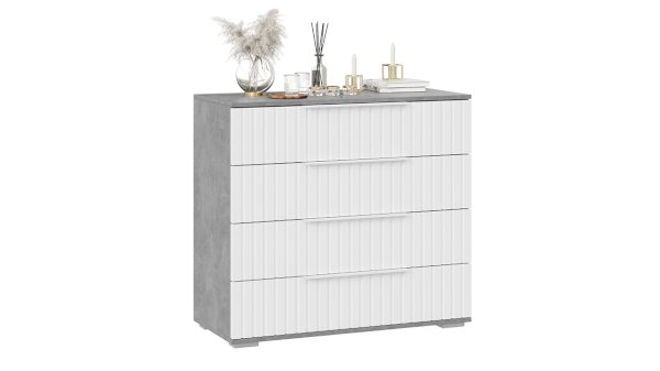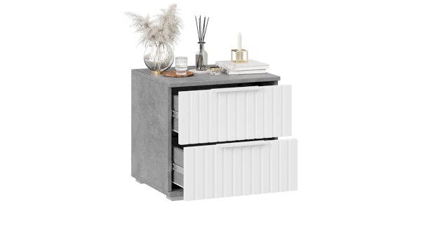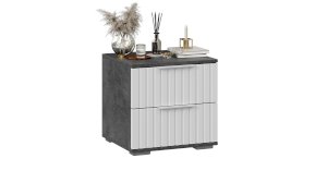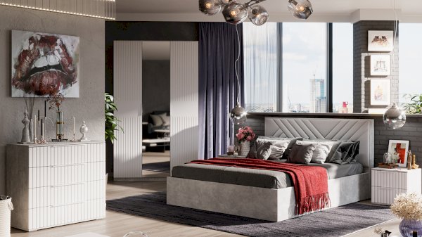 Декор. Мебель для спальни непременно должна быть изготовлена из надёжных материалов, именно такой и является наша новинка. Каркас выполнен из ЛДСП с имитацией бетонной поверхности «Ателье светлый», а фасады МДФ облицованы пленкой ПВХ «Белый матовый» и декорированы вертикальной фрезеровкой. Визуальный объем и глубину рисунка «Ателье» подчеркивает суперматовая структура, которая отлично сочетается с однотонными декорами, а белый цвет в интерьере является наиболее популярным, ведь он расширяет пространство, добавляет воздуха и свежести.