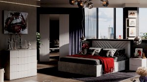Модульность. Коллекция содержит в себе грамотно подобранные модули, которые помогут создать свой неповторимый интерьер: тумба прикроватная и комод с выдвижными ящиками, вместительный 3х створчатый шкаф с металлической штангой и полками. Стильным акцентом набора является кровать. Каркас кровати в сочетании с изысканным мягким изголовьем не будет отвлекать, а наоборот, поможет найти гармонию в привычном.