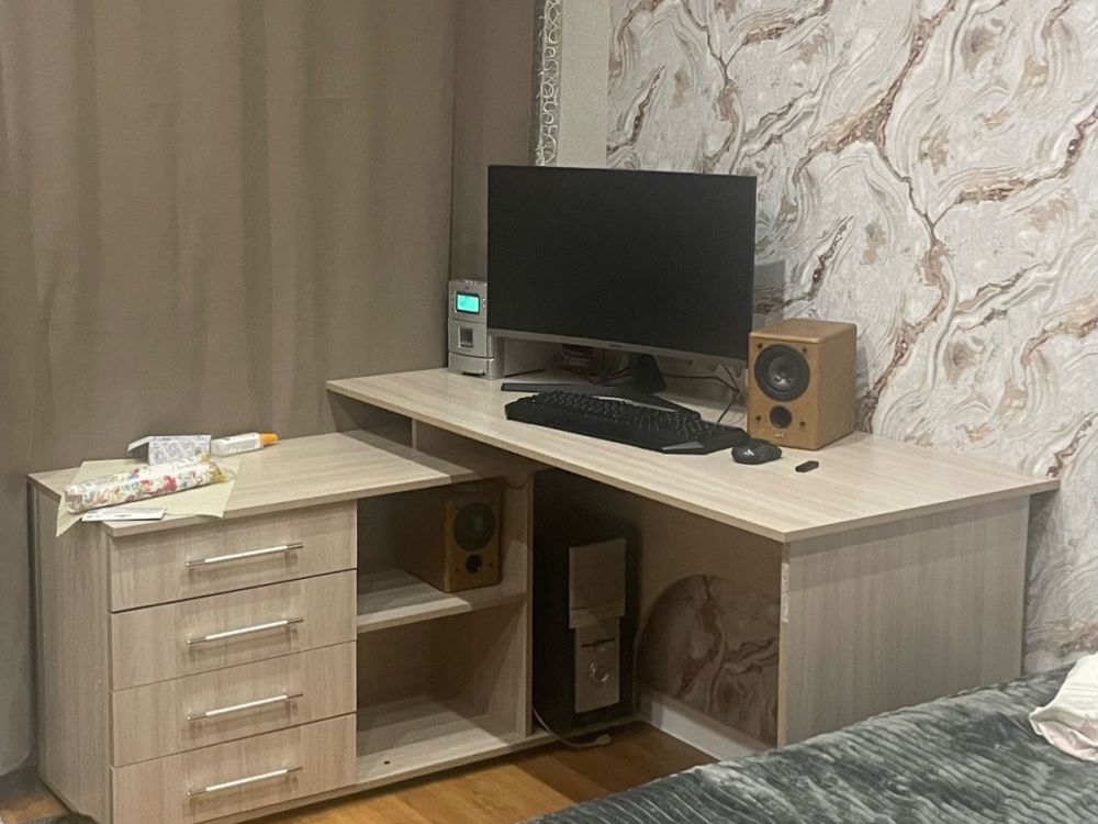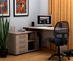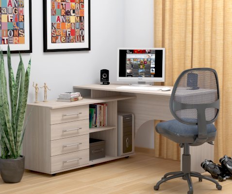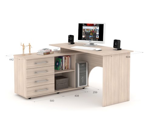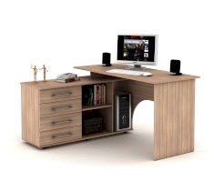 Компьютерный стол СКУ 15– функциональное место для работы и система хранения 2 в 1 Лаконичный дизайн подойдет для домашнего кабинета, офиса или подростковой комнаты. Несмотря на внешнюю компактность, стол является настоящим мини-офисом. Размеры столешницы достаточны для комфортной работы на ноутбуке и стационарном компьютере. Здесь найдется место для монитора и всей необходимой техники, книг, документов и канцелярских принадлежностей. Слева есть тумба с двумя ящиками и открытыми полочками для книг и разнообразной канцелярии. Так же, там отлично разместится системный блок от компьютера. Стол выполнен из ЛДСП — прочного и долговечного материала, который устойчив к механическим деформациям, воздействию влаги и температурным перепадам.