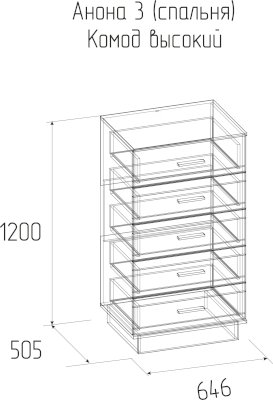 Комод высокий АНОНА 3 с 5 ящиками - очень вместительный, практичный и стильный предмет домашнего интерьера, который соответствует всем правилам эргономики. Узкий комод с древесными вставками не займет много места в сальне. Выдвижные ящики удобны для хранения белья, одежды и аксессуаров. Ящики оснащены шариковыми направляющими полного выдвижения. Это дает возможность использовать всю полезную площадь ящика.