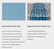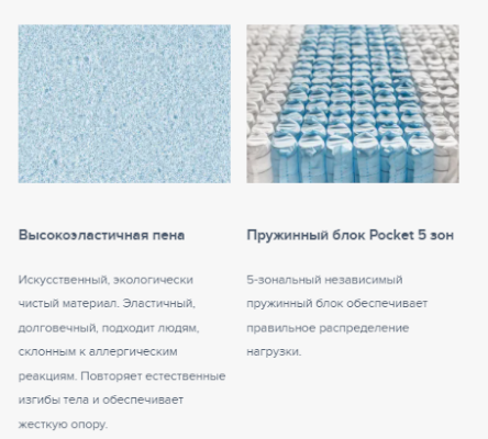 В основе матраса блок независимых пружин Pocket 5 Zone, имеющий 5 зон различной степени упругости, плотностью 512 пружин на спальное место. Благодаря использованию проволоки различного диаметра каждая из зон обеспечивает правильное распределение нагрузки. В качестве наполнителя мягкого слоя используется современная пена Foam, дышащая и гипоаллергенная, безопасная. Матрас Eco soft самый мягкий в коллекции Eco. Чехол выполнен из приятного турецкого трикотажа с вискозой в составе, простеганного на объемном гипоаллергенном синтепоне.